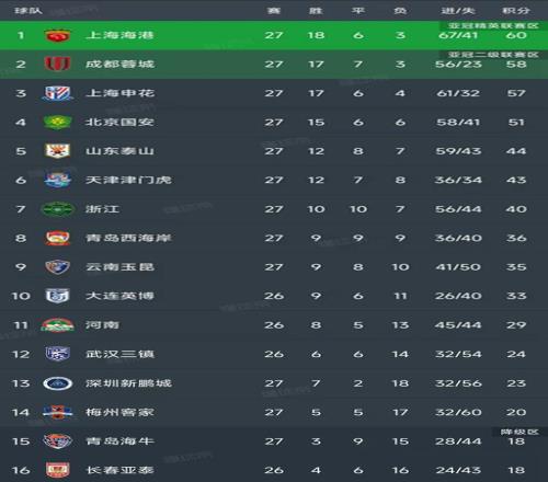 中超最新积分榜