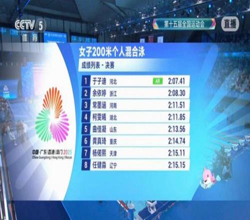 11月11日,全运会游泳女子200米混合泳:13岁于子迪2分07秒41刷新叶诗文所保持的亚洲纪录,收获金牌,余依婷获得亚军。