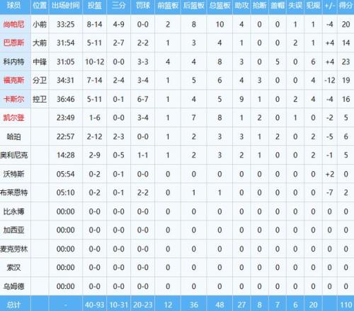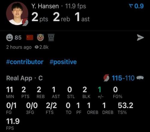杨瀚森替补出战约11分钟,投篮1中0,罚球2中2得到2分2板(1前场板)1助2帽,其中封盖数全队第一,帮助开拓者115-110干翻高居西部第二的马刺。