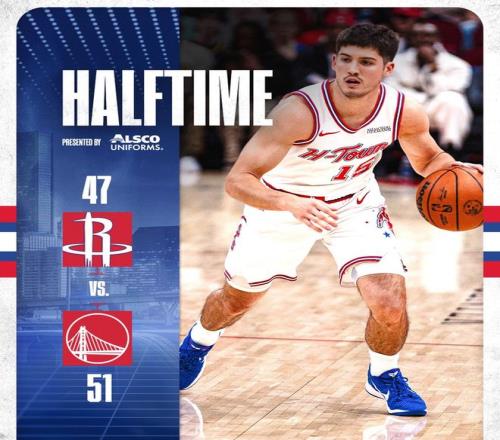 谢泼德接球转身中投再中,第二节4投全中已经连得9分,打停勇士。小史密斯追防连续拉拽桑托斯,裁判吹罚“快攻犯规”勇士两罚一掷,重新领先到两位数。申京送抛传,阿门力压斯潘塞完成双手隔扣,伊森篮下强打上篮再得手,火箭又打出一波12-2将比分追平。阿门上篮被筐帽,随后空位三分投出三不沾被勇士反击,上半场战罢,火箭以47-51落后勇士4分。